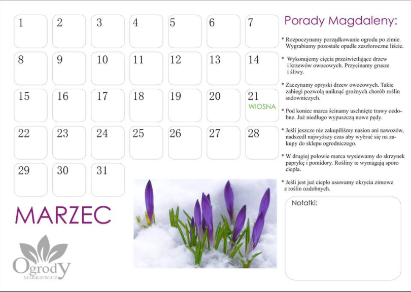 Na koniec jeszcze kartka z kalendarza na marzec z poradami ogrodniczymi odnośnie pielęgnacji ogrodu na przełomie zimy i wiosny. Mamy nadzieję, że będzie dla Was inspiracją 🙂