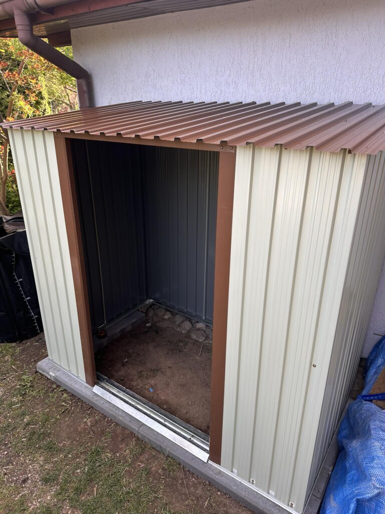 Domek narzędziowy ustawiliśmy nieco inaczej niż wskazano w instrukcji montażu. Musieliśmy ustawić domek odwrotnie, tzn. tyłem na przód, ponieważ spadek dachu musiał być w tym przypadku w kierunku ogrodu.