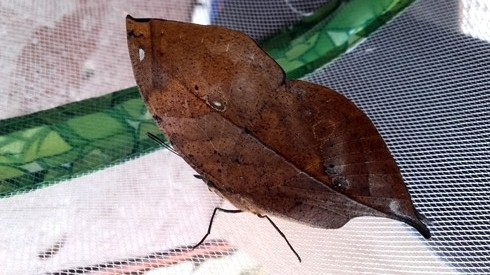 Pozostając w temacie motyli, pragnę zaprezentować Wam kolejnych naszych podopiecznych. Ten motyl dzienny w kolorze indygo z charakterystycznymi jaskrawo pomarańczowymi pasami to Kallima inachus, popularnie zwany „motyl liść”. Dlaczego? Zerknijcie na kolejne zdjęcie, tam ma złożone skrzydełka i przypomina uschnięty liść – istny mistrz kamuflażu. Prawda że ciekawy osobnik? 🙂