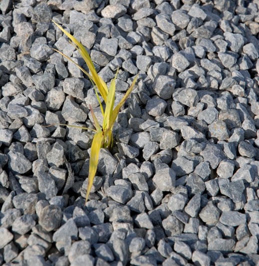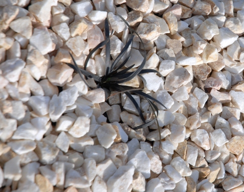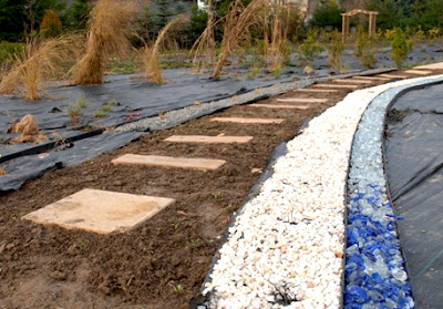 Na tle białego grysu – czarna trawa konwalnik oraz imitacja strumyczka