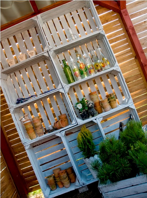 Zapraszam dziś do odwiedzenia naszej pracowni 🙂 Wprawdzie półeczki mam już od kilku tygodni jednak dopiero dziś mam chwilkę aby je opublikować na blogu. W zeszłym roku postawiliśmy zadaszoną wiatę, gdzie wykonywaliśmy wszelkie prace związane z przesadzaniem i rozmnażaniem roślin. W tym sezonie dorobiliśmy się oryginalnej półeczki z recyklingu. Postarałam się o drewniane skrzynki po owocach z hurtowni warzywnej i osobiście pomalowałam je białą farbą do drewna. Nałożyłam kilka warstw farby, aby pokryć wszelkie przebarwienia. Gdy skrzynki przeschły mój Sz. pozbijał wszystko w jedną całość i tak powstał mój nowy mebelek. Jestem z niego bardzo dumna, gdyż prezentuje się naprawdę okazale. Sami oceńcie.