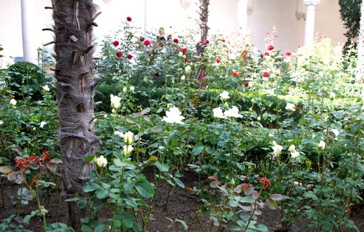 Dominują tu strzyżone bukszpany, białe rabatowe róże, kolorowe kwiaty