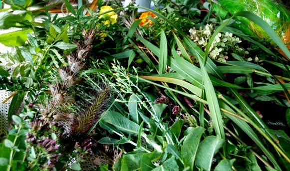 Dominują kwiaty z rejonów basenu Morza Śródziemnego : akanty oraz liście akantów, liście figi, kwiaty szałwi omszonej, lawendy, niebieskie hortensje jak również nasze rodzime gałązki rokitnika