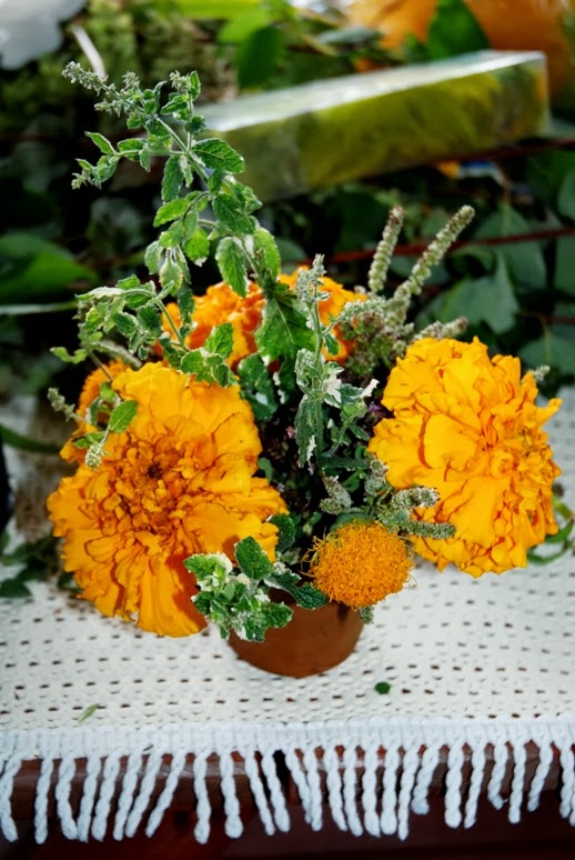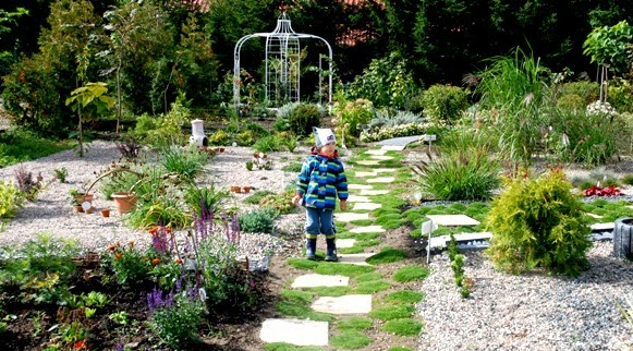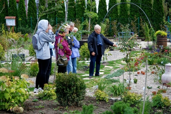 Dominują kwiaty wiejskie: nagietki, werbeny, aksamitki, piwonie, malwy, naparstnice)