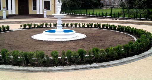 dookoła posadzone zostały tuje hoseri oraz bukszpany