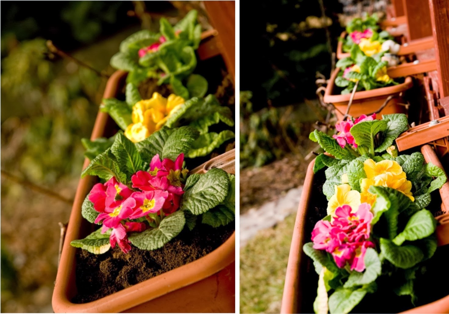 Zawsze obsadzam skrzynki balkonowe w kwietniu – bratkami , później wymieniam je na surfinie lub petunie. W tym roku jednak wiosna przyszła tak szybko, że nie wytrzymałam do kwietnia i taras rozkwitł kolorowymi prymulami.