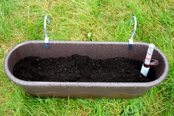 w skład zestawu wchodzi: skrzynka z podwójnym dnem; metalowe zaczepy, knoty nawadniające, miarka poziomu wody oraz zatyczka