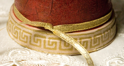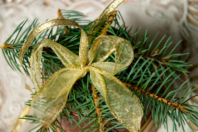 oraz ozdobnymi tasiemkami i gałązkami iglaków.