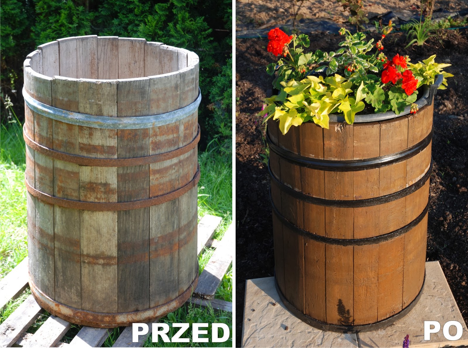 Odnowiona beczka stanowi teraz dekorację wiejskiego ogródka