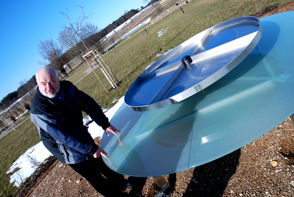 Pan Krzysztof prezentuje stół do edukacji ekologicznej.