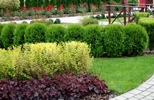 Podobają mi się jednakowe nasadzenia – np. szpaler identycznych tuj, berberysów czy trzmielin.