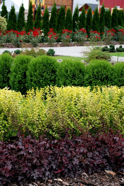Posadziłam już tujki brabanty (będzie zielona ściana żywopłotu), niższe piętro stanowic będzie żółta trzmielina,