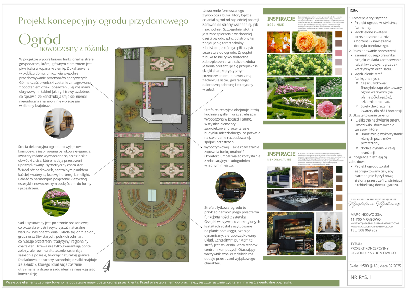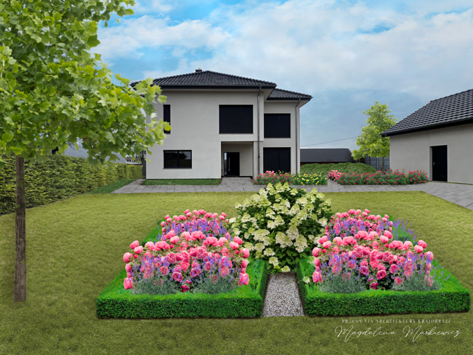 | Cechy: | Ogród zaprojektowano w nowoczesnym stylu, podkreślającym prostotę form oraz uporządkowaną kompozycję. Elementy formalne, takie jak symetryczne układy rabat oraz wyraźnie zdefiniowane strefy, współgrają z subtelnymi akcentami barokowymi w wydzielonych kwaterach dla róż i hortensji. |