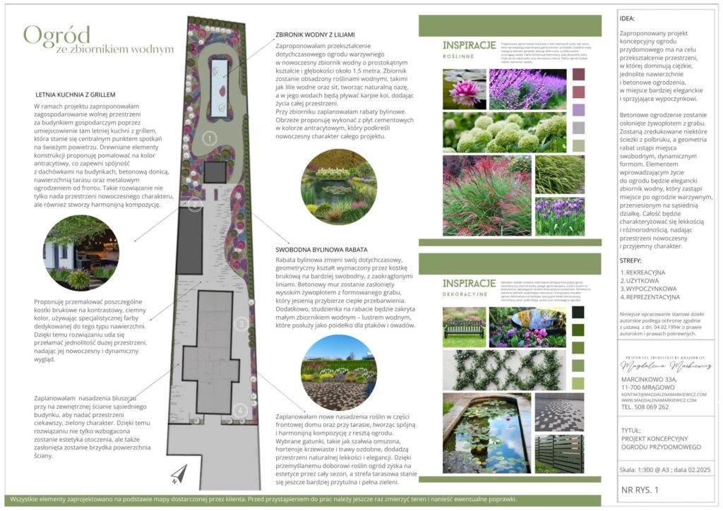 | Cechy: | Dzięki wprowadzeniu subtelnych, ale efektownych rozwiązań – takich jak osłonięcie betonowego ogrodzenia żywopłotem, redefinicja układu ścieżek oraz centralny zbiornik wodny – przekształcona przestrzeń zyska nowoczesny, elegancki i funkcjonalny charakter, idealny do codziennego wypoczynku i spędzania wolnego czasu. |