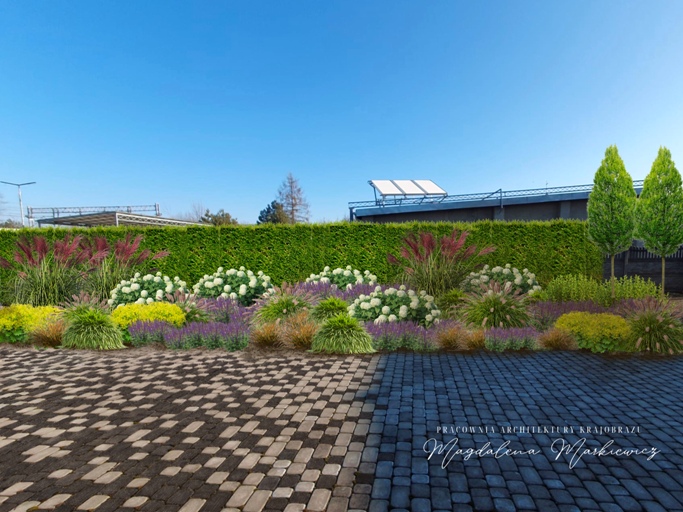 W ramach projektu betonowe ogrodzenie zostanie subtelnie ukryte za bujnym żywopłotem z grabu, co nie tylko złagodzi surowość architektonicznego rozwiązania, ale również stworzy naturalną barierę zapewniającą prywatność. Równocześnie zaproponowano ograniczenie liczby tradycyjnych ścieżek