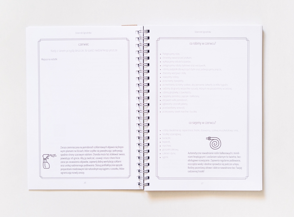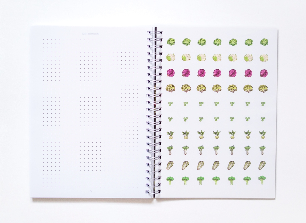 Dziennik Ogrodnika powstał w wyniku realnych potrzeb, jakie pojawiły się podczas planowania mojego ogrodu. Nie mogło w nim zabraknąć tabel z planowanymi terminami wysiewu nasion, sadzenia roślin czy zbioru plonów. Zawsze chciałam posiadać profesjonalne narzędzie do planowania czynności ogrodniczych, ale nie mogłam takiego znaleźć na polskim rynku. Postanowiłam sama zaprojektować planer ogrodniczy, w którym znajdą się tylko istotne informacje, niezbędne tabele oraz dużo miejsca na inspiracje. Zaprojektowałam go z myślą o wszystkich miłośnikach ogrodów, którzy chcą planować po swojemu i tak jak lubią. Dlatego też sporo miejsca zajmują wykropkowane strony (Bullet Journal), w które można wrysować grządki warzywne, a następnie uzupełnić je dedykowanymi naklejkami warzyw.