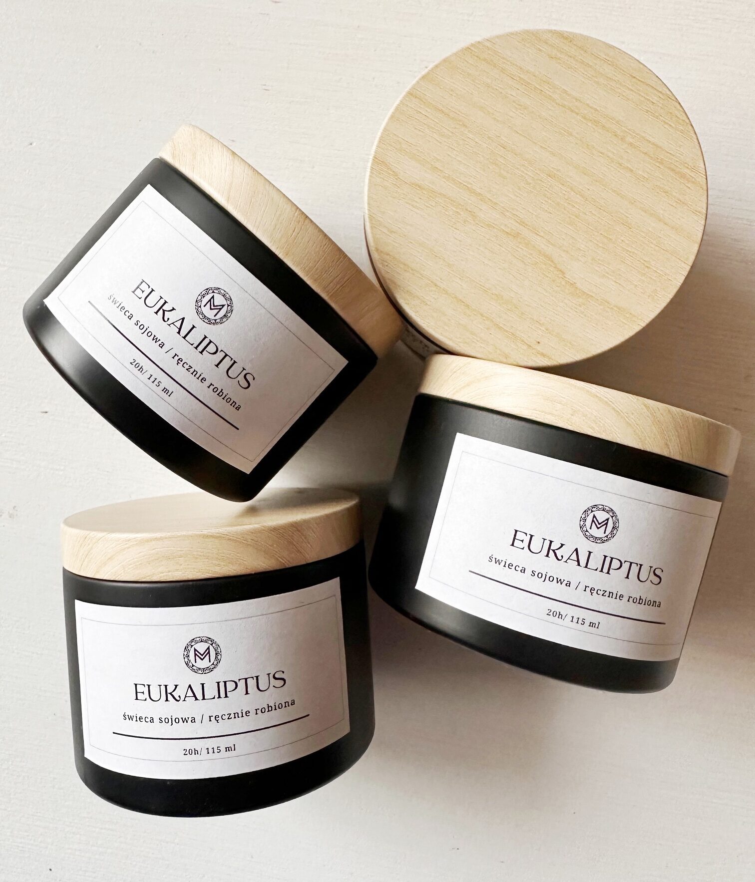 - ręcznie wykonana świeca z naturalnego wosku sojowego z dodatkiem naturalnego olejku o zapachu eukaliptusa (delikatny aromat),