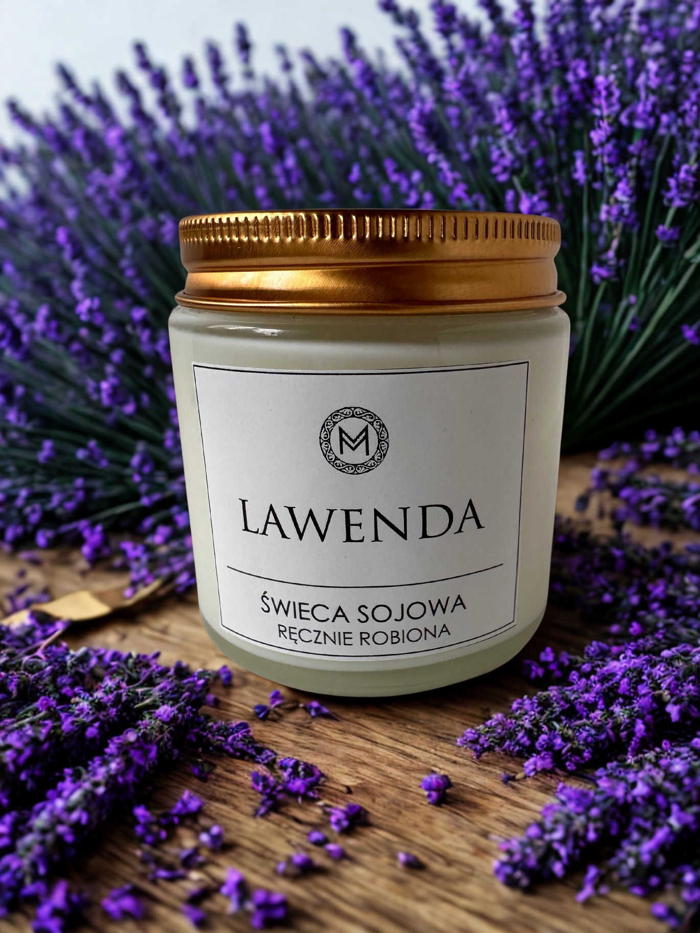 • ręcznie wykonana świeca z naturalnego wosku sojowego z dodatkiem naturalnego olejku o zapachu lawendy,