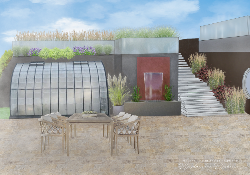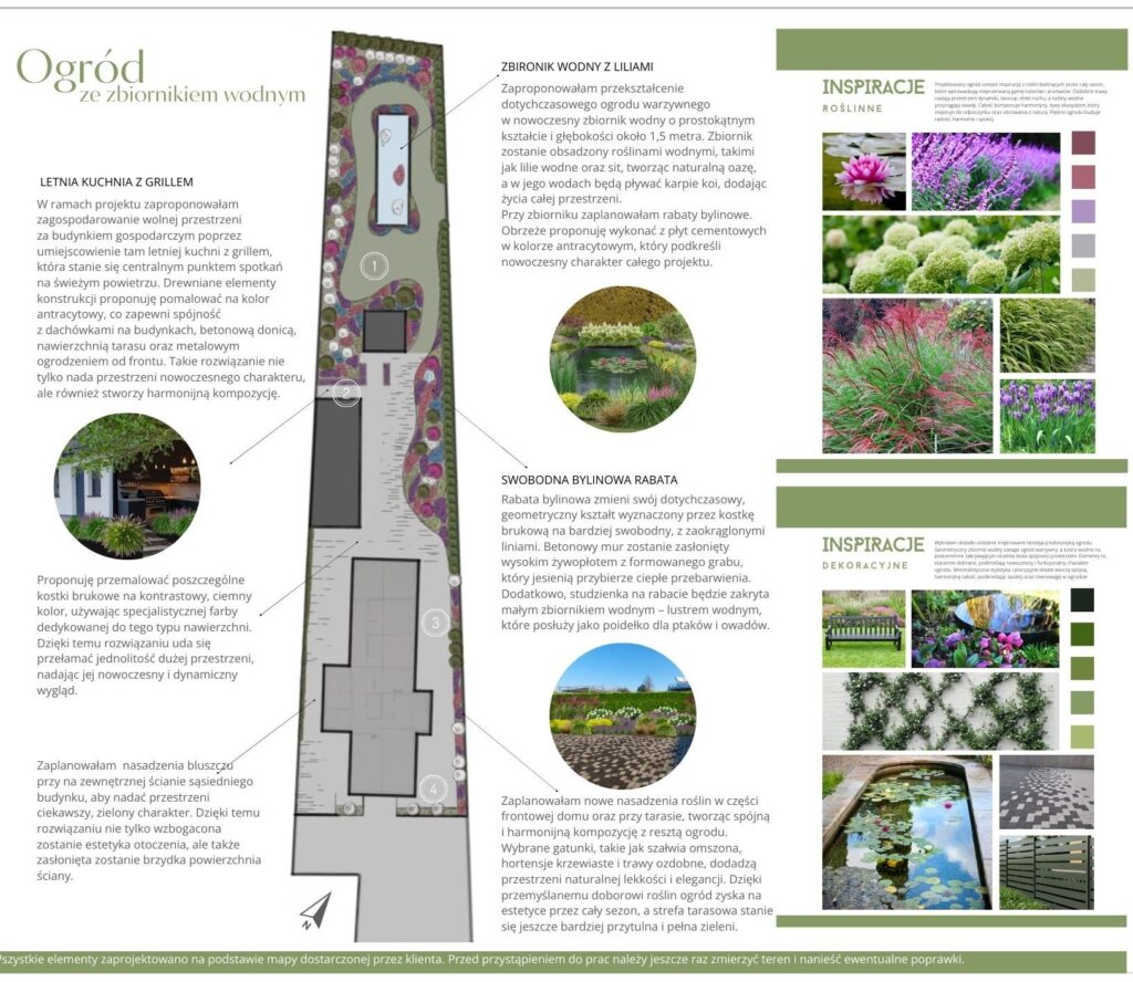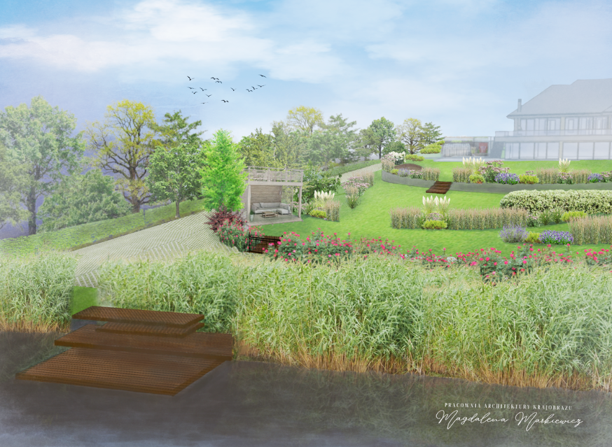Betonowe ogrodzenie zostanie osłonięte żywopłotem z grabu. Zostaną zredukowane niektóre ścieżki z polbruku, a geometria rabat ustąpi miejsca swobodnym, dynamicznym formom. Elementem wprowadzającym życie do ogrodu będzie elegancki zbiornik wodny, który zastąpi miejsce po ogrodzie warzywnym, przeniesionym na sąsiednią działkę. Całość będzie charakteryzować się lekkością i różnorodnością, nadając przestrzeni nowoczesny i przyjemny charakter.