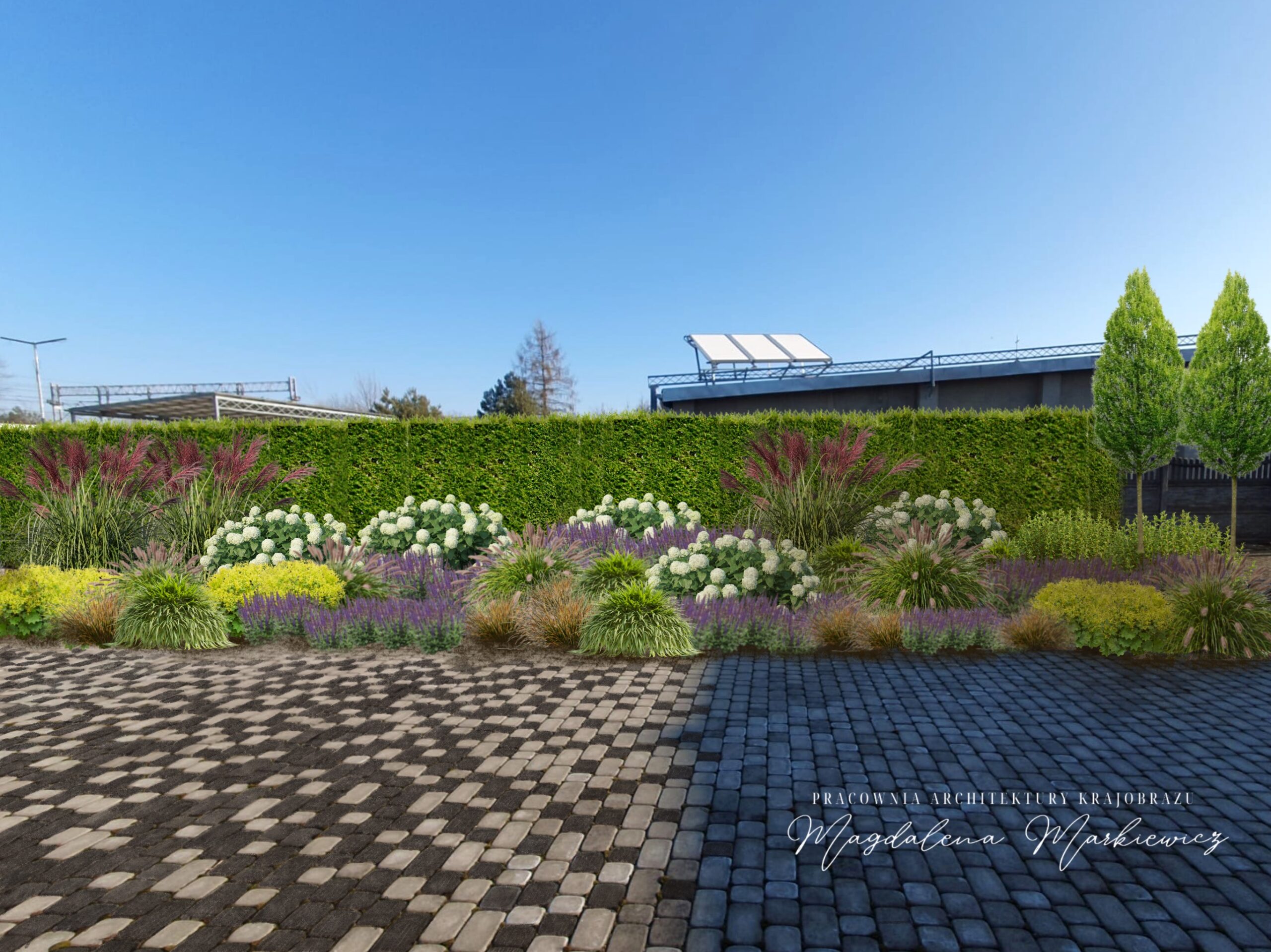 • Zbudowanie zielonej ścianki osłonowej z wąskich grabów szpalerowych, maskującej ogrodzenie oraz wprowadzającej wertykalny akcent.