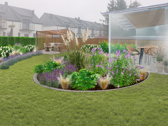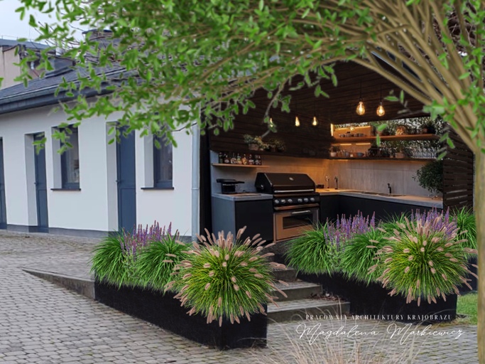• Dodanie różnorodnych roślin: traw ozdobnych, liściastych krzewów i małych drzew, podkreślających poszczególne pory roku.