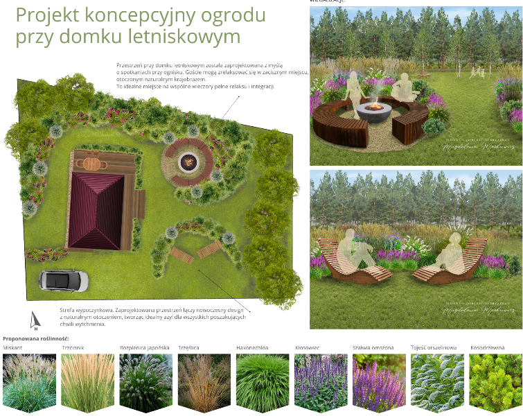 Centralnym punktem jest strefa integracji z wydzielonym miejscem na ognisko, która zachęca do wspólnych spotkań. W części wypoczynkowej znalazły się leżaki do opalania, otoczone delikatnie rosnącymi bylinami i trawami ozdobnymi, co gwarantuje intymność i relaks. Natomiast od strony wschodniej, kilka brzóz odmiany Doorenboos tworzy naturalną strefę zabaw dla dzieci – idealne miejsce do gier, zabaw w chowanego czy chwili relaksu przy drewnianej, okrągłej ławeczce lub na hamakach rozwieszonych między drzewami. Całość projektu harmonijnie współgra z mazurskim krajobrazem, podkreślając naturalne piękno otoczenia.